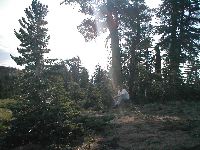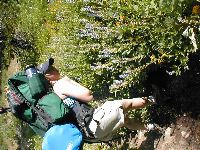 ![]() P7310078.JPG Kady admires flowers on our way back to Cold Stream Meadow. The downhill wasn't any easier on her feet than the uphill; by lunchtime, she was limping, and I ended up taking most of the weight from her pack to make things easier. |