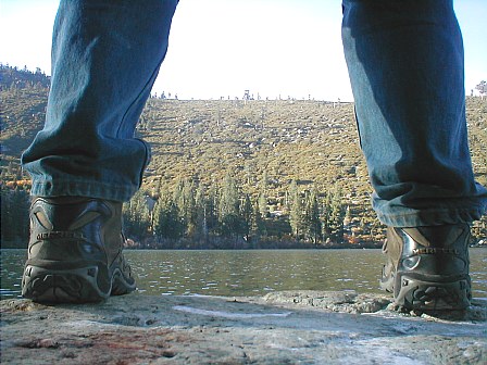 October 27, 2003 ... My weekend in pictures ................................. (Permalink) Long-time friend and fellow outdoors addict FC dropped by for an act of spontaneous camping -- it's late October, the weather's sunny and summer-warm, and he knows this great spot in Lakes Basin, about an hour's drive north of where I live, in the Sierra high country ... We pulled in at about 1 a.m. The campground was literally completely deserted. They'd shut down operations for the season and just hung a little shingle out front saying "No services available -- You pack it in, you pack it out." We set up our sleeping bags and marveled at the stars and an unexpected meteor shower. Then, the next day -- today -- we got up. I broke down and, for only the second time in my adult life, deigned to wear a pair of jeans ...
