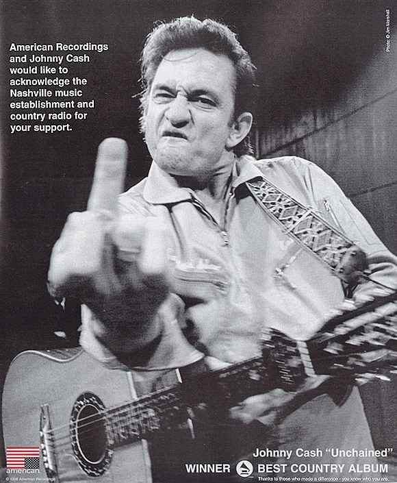 He was one of those rare artists with both a strong inner compass and a strong moral compass -- both admirable qualities on their own, but powerful when combined. He wasn't afraid to be controversial, or alienate his fans, if he thought it would move his message -- as his arguably most famous stunt shows. He took out a full-page ad in Billboard magazine upon winning a Grammy for his album "Unchained," literally flipping off the country music establishment for its lack of support of older artists. And, of course, his music was motivated by a life-long commitment as a Christian; many of his hits, like "Ring of Fire," were overtly religious, and even in his autobiographical anthem "Man in Black" he explained: "I wear the black for those who never read / Or listened to the words that Jesus said / About the road to happiness through love and charity / Why, you'd think He's talking straight to you and me." I don't happen to agree with the particular religion behind his faith, but he sang because he was passionate about it -- and that sort of passion, plus his unwavering dedication to his craft, show us what we can accomplish when we have a message we want to bring to the world. He didn't have a silver voice, or Justin Timberlake looks, or Danny Elfman orchestration genius; but he had perseverance, and a message, and the balls to flout social convention if it meant getting heard. More importantly, he knew his intended audience. He was never about the mainstream music-buying public. He spoke out, reached out, to people with problems, and connected with them -- the highest aspiration of someone trying to make the world a better place. He's known for songs like "Folsom Prison Blues" and his recent cover of the Nine Inch Nails metal anthem "Hurt" -- speaking about the problems of the alienated, the lost, the fallen. He gave concerts frequently at prisons, and recorded at least two live albums there. Bob Gendron, in this article, sums it up best, I think, offering perhaps the most profound eulogy anyone could write for a man whose music transcended his life: If you stop and think about it, Cash has been making music since 1955 -- 1955! Consider: Never once has he fallen prey to convention, trends, or commerce. He's had bouts with painkillers, uppers, and alcohol, but not once did he sell out to anything. He's embraced prisoners, soldiers, blue- and white-collar workers, and championed civil, human, and equal rights in his music and conduct. ... His extended middle finger is the subject of the most quintessential rock and roll photo ever snapped. He's been celebrated by everyone from Bob Dylan to Bono to Wyclef Jean. It's only fitting that Johnny Cash be recognized as the first punk, music's longstanding rebel, the bearer of truth. Cash's music is America, as through his songs, we see a reflection of ourselves, our history, fears, and hopes. I hope Cash's legacy -- both musically, and as a celebrity willing to give the world a kick in the ass it still sorely needs -- carries on.