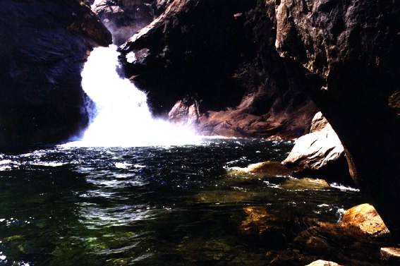 Roaring River Falls (between Cedar Grove and Road's End). A very inspiring location. Wouldn't want to swim, though -- between the current and the temperature, that water's best left untouched.
