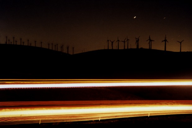 One of the great aspects about night photography is that you see the world in an entirely different way after the pictures develop. The naked eye can't perceive the streaks of light that make up this photograph. The naked eye, on the thin-mooned night I took the photo, couldn't distinguish the windmills from the sky behind them. Time changes all that.