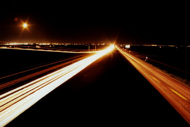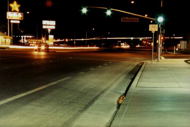F-16 at night? Isn't that a tiny aperture? Yes. Knowing that I had the previous picture's exposure close to correct, I made a spot calculation. I wanted at least a minute or two of traffic -- and to maintain the same exposure as the 8-second picture I had to close the aperture to compensate. Frankly, I like this effect better, so don't limit yourself to large apertures just because light is low.